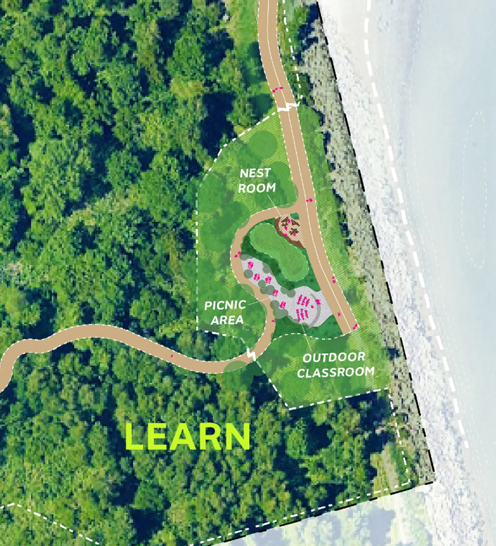 The concept plan organizes the site around three main “forest pockets”—Eco, Gather, and Learn—each offering a distinct experience with flexible spaces for exploration, gathering, and reflection.