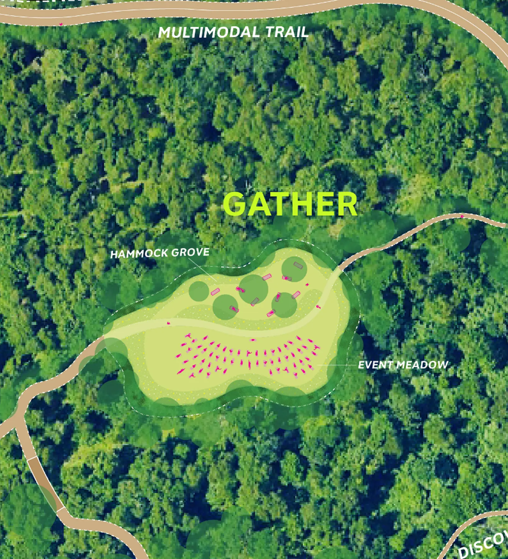 The Gather Pocket creates a warm, open clearing within the forest where visitors can come together in a simple, natural setting. The northern side features a lifted hammock grove beneath a light canopy of trees, offering a playful place to rest, read, or take in the quiet of the woods. To the south, a flexible meadow space can be mowed for small events, neighborhood activities, or informal gatherings, giving the community room to spend time together outdoors.