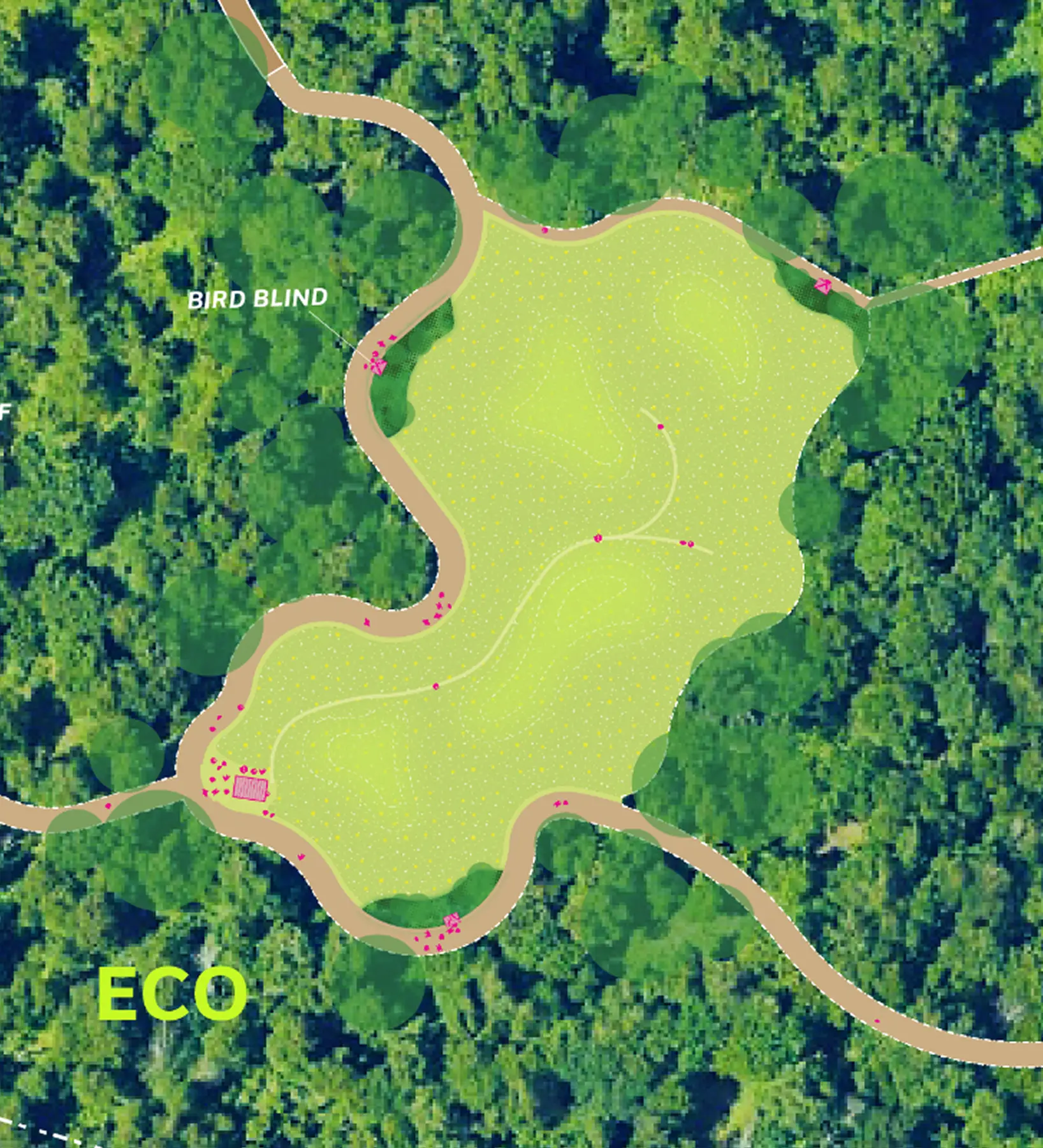 The Eco Pocket is a 1-acre diverse meadow pocket at the center of the Northern Forest. Visitors can look forward to sweeping grasses, seasonal wildflowers, and the quiet movement of birds and pollinators that thrive in this mix of wet and dry meadow conditions. Subtle topographical changes create different areas of light and moisture, shaping a landscape that shifts throughout the year.